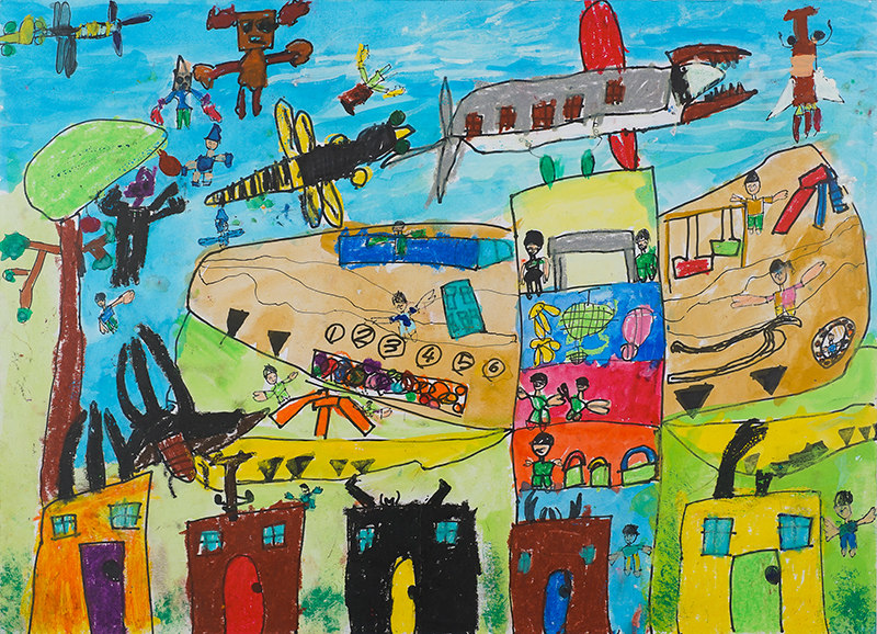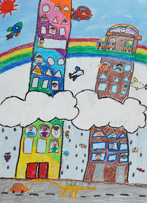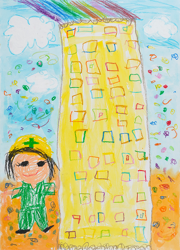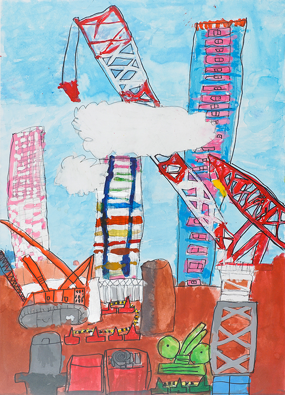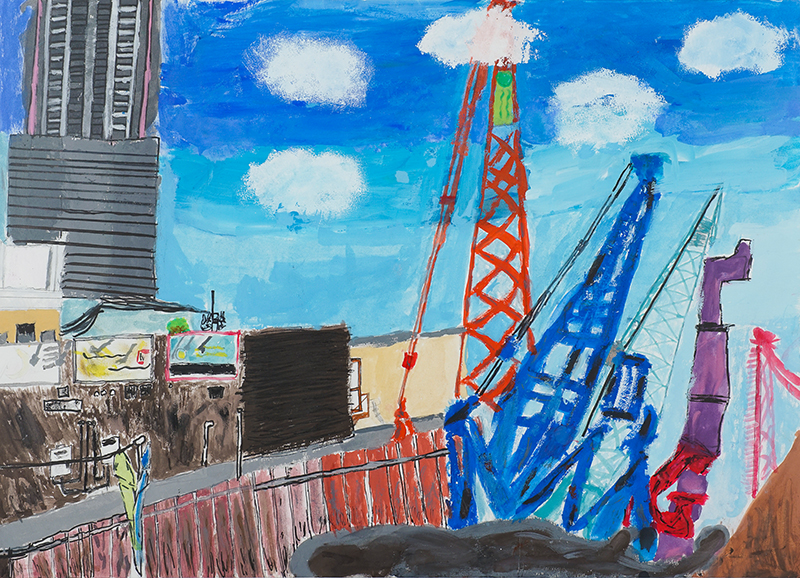 『くもよりたかいクレーンとカラフルなビル』